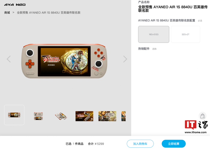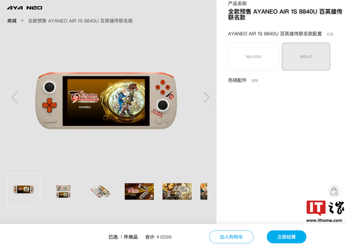 IT之家 6 月 14 日消息,AYANEO AIR 1S 百英雄传联名限量掌机今日上线官方商城开启预定,拥有 16G+512G 和 32G+2T 两种配置,售价 5299 元起。
