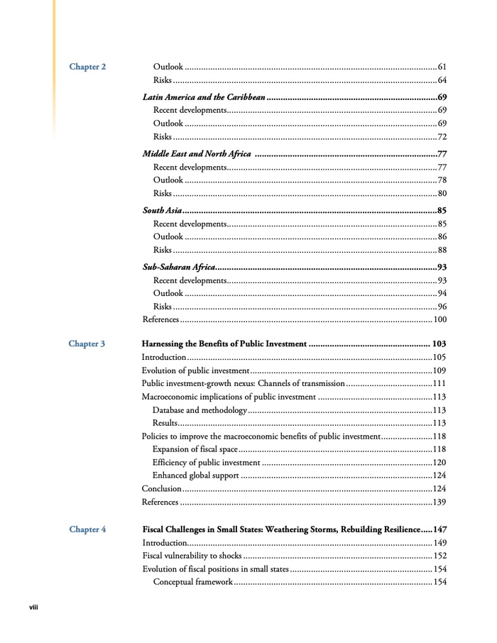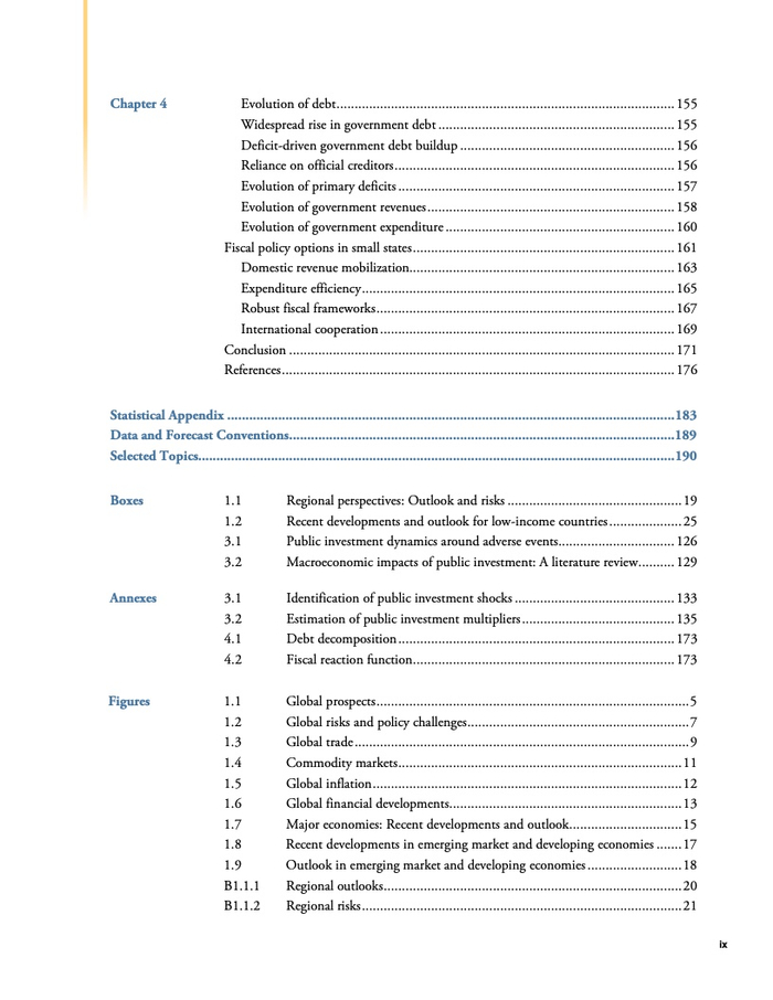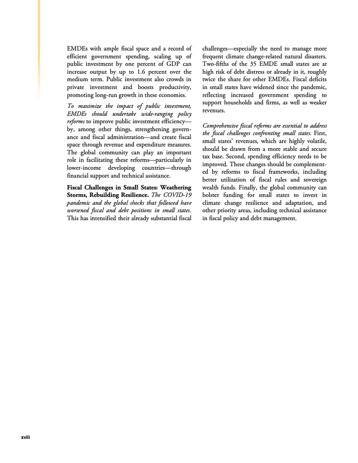 另一章分析探讨了小国(人口约为150万或更少的国家)为何面临长期财政困难。在35个发展中小经济体中,五分之二面临债务困境的高风险或已经陷入债务困境。这一比例约为其他发展中经济体的两倍。小国应当需要进行全方位的改革来应对财政挑战,主要是借助:借助更加稳定和安全的税基获得财政收入;进一步提升支出效率,尤其是在卫生、教育和基础设施方面;采取使用财政框架来应对日益频繁的自然灾害和其他冲击。此外,国际社会有针对性和协调一致的政策能够帮助推动这些国家走上更可持续的财政道路。