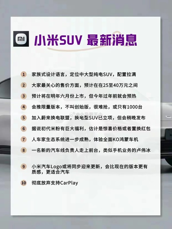 【CNMO科技消息】近日,有网友汇总了小米SUV车型的10大最新消息,包括售价25万-40万以及明年6月上市等信息。不过, 其中有些消息的可靠程度很低,因此大家简单吃个瓜就行,不必过于当真。