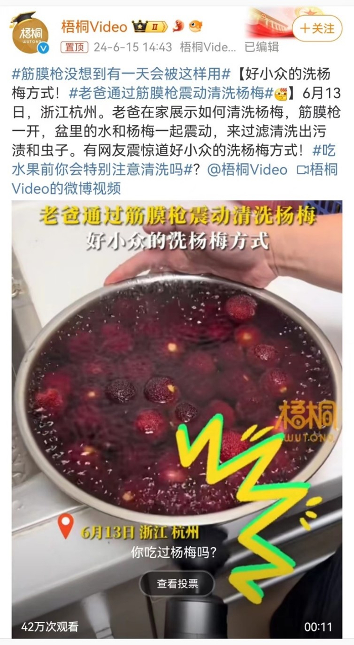 延续刚才的话题,还是刚才的主角筋膜枪。众所周知,筋膜枪是一种运动康复工具,通过高频率冲击放松身体的软组织。杭州男子也正是利用它的高频振动清洗的杨梅。不过它的本事可不仅限与此。