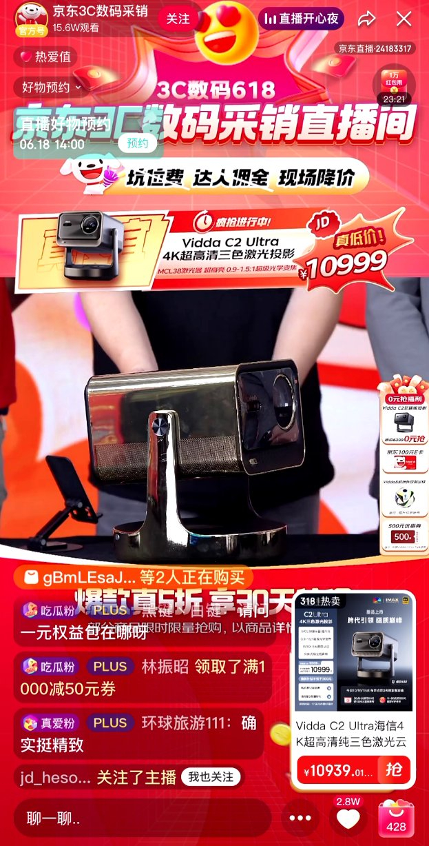 在直播中,赵烁透露Vidda C2系列三色激光投影在今年整个618周期表现非常亮眼,核心产品排到了投影类目前三甲,成为名副其实的爆品。“MR.厉害”则是在深入体验和评测之后对Vidda C2的画质和各项设计表示了专业级的肯定。