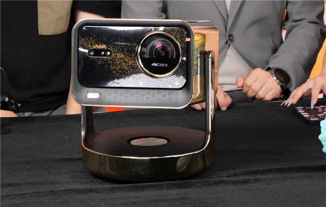 刘为杰表示海信今年已经是连续第三次成为欧洲杯赞助商了,Vidda投影作为2024欧洲杯官方指定智能投影,联合海信工业设计中心定制设计了这款限量版的“冠金投影”,其机身大部都采用24K镀金工艺,正面部分也采用了非常时尚炫酷的洒金装饰。在直播中,几位嘉宾一同开箱了“冠金投影”,而投影从包装箱中取出来那一刻,闪亮的真金机身让所有正在观看直播的网友都惊叹不已。