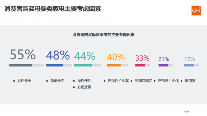 在消费者购买母婴家电最主要的考虑因素中,超过一半的人群认为“材质安全”最重要;选择“功能全面”和“操作便利、方便携带” 的消费者也超过四成;“性价比高”“口碑好”等因素紧随其后。母婴家电的未来发展正向着智能化、健康化、个性化和丰富化的方向发展。