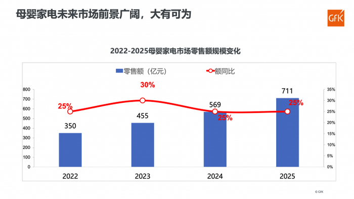 根据GfK数据,母婴家电市场未来前景广阔,大有可为。预计2024年全年母婴家电市场零售额将达到569亿元,同比增长25%;2025年仍将保持良好的增长态势,零售额预计达711亿元,同比将增长25%。