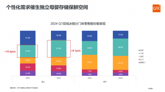 个性化的使用需求催生了母婴产品的个性化功能。以冰箱为例,具备“独立母婴室”等存储空间的十字冰箱在双线渠道都呈现出较好的增长态势:GfK中怡康线上周度/线下月度监测数据显示,2023年十字冰箱线上市场额份额为27.2%,较2022年增长了10.3个百分点;2024年一季度十字冰箱线上市场额份额达到37.5%,同比增长8.1个百分点。同时,母婴家电品类覆盖了“衣食住”等多种场景,具有高温煮洗消毒功能的洗衣机、适合不同配方奶的温奶器、一机多用的辅食料理机等产品日益丰富。