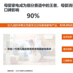 根据GfK中怡康推总与预测数据,2024年中国家电市场整体规模将达到8699亿元,其中厨卫家电和生活家电规模同比微涨。由于当下年轻一代消费者育儿观念的转变,母婴家电市场需求上升并成为细分赛道中的王者。追求健康品质,喜欢尝鲜,注重口碑影响,成为消费者最显著的特征。《2023母婴行业洞察报告》数据显示,近九成的孕育女性都关注过母婴类家电产品,有50.8%的用户认为选购专业的母婴家电非常有必要。