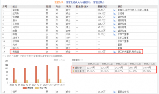 据东方财富网数据显示,龚胜昔的薪酬为123.9万元,据悉,在现任高管中,首席信息官徐峰的薪酬为135.6万元。除了龚胜昔以外,华安证券总经理助理汲杨也是一位女性高管,去年上任薪酬为107.4万元,和龚胜昔只差16.5万元。