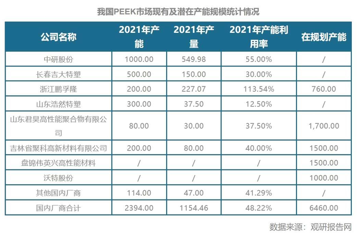 其中,中研股份是全球第四大PEEK生产商,是目前PEEK年产能和产量最大的中国企业。现已超过英国威格斯,在国内市场实现了进口替代。根据中研股份2023年财报显示,PEEK产能1000吨,产能利用率98%。