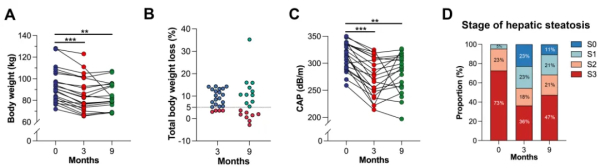 数据显示[1]:除显著减重效果外,患者在置入第3个月和取出后6个月后,与基线相比,与脂肪肝严重程度相关的参数(脂肪肝指数、肝脂肪变性指数、控制衰减参数)均显著下降,肝脏脂肪变性持续改善,处于重度脂肪肝的患者比例显著降低;患者的APRI值(天冬氨酸氨基转移酶与血小板比值指数)显著下降。
