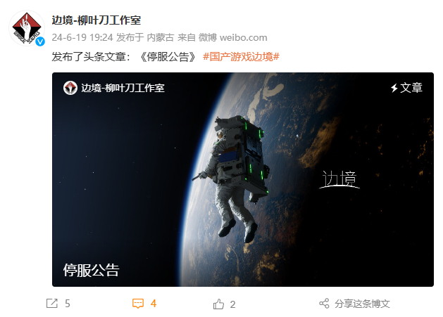 国产射击游戏《边境》宣布停服,柳叶刀工作室力争夺回游戏运营权