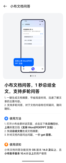 小布助手还支持全新的文档问答功能。用户在对话界面可以通过输入手机本地文档,获得文章摘要,文档内容问答等帮助。