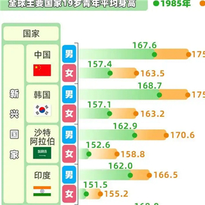 根据《柳叶刀》最新研究显示,近35年来,中国人的身高越来越高,19岁中国男性的平均身高为175.7厘米,中国女性的平均身高为163.5厘米,为全世界身高增幅最高的国家,甚至有”赶英超美”的趋势。