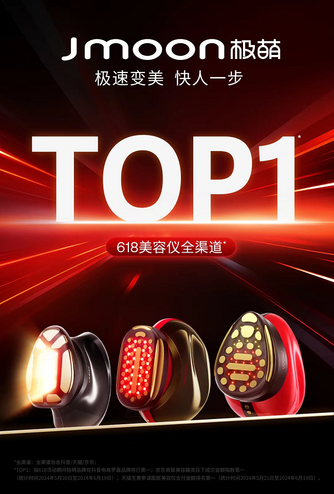 在射频美容仪时代,极萌已经凭借其高品质和有效性成为行业标杆,在多次大型电商活动中荣获冠军,更是在今年行业新规实施后的首次618中,再次以无可争议的实力夺得了Top 1的宝座。这不仅证明了Jmoon极萌品牌在家用美容仪领域的强大竞争力,也彰显了其在推动行业发展和创新方面的引领作用。