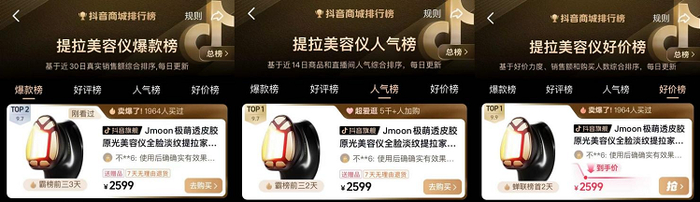 在短短一个月时间内,这款产品便在各大电商平台上大放异彩,取得了销售破亿的佳绩。尤其在抖音平台,透皮胶原光美容仪强势霸占爆款榜、人气榜、好价榜的前三甲。消费者的热烈反响与抢购热潮,都彰显了市场对这款“抗衰新物种”的高度青睐与迫切需求。