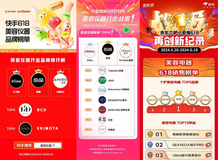 随着本次618落下帷幕,Jmoon极萌品牌以一骑绝尘的表现,交出了一份亮眼的成绩单。根据多个电商平台发布的数据及榜单显示,极萌在今年618期间,在家用美容仪类目中遥遥领先,全渠道稳居销售冠军宝座。在抖音商城的美容仪器榜单中,极萌品牌位居榜首;在京东的个人护理美容电器榜单中同样斩获了TOP1 的位置;在快手平台上,极萌再次夺得美容仪器行业TOP 1的位置,显示了其在直播电商领域的卓越成绩。