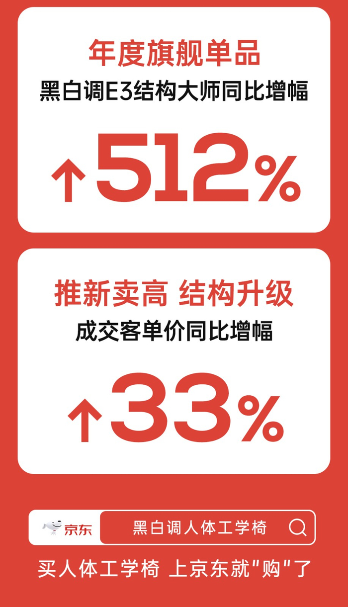 据品牌全周期数据显示,黑白调618全周期GMV同比增幅61%,年度旗舰单品黑白调E3结构大师同比增幅512%,品牌京东全店成交客单同比增幅33%,天猫全店同比增幅45.67%。其中,黑白调P1人体工学椅热销超20000把,荣登京东行业销量top1,黑白调E3结构大师登天猫行业热卖榜单top2,品牌斩获618全期电脑椅行业类目品牌榜top2。