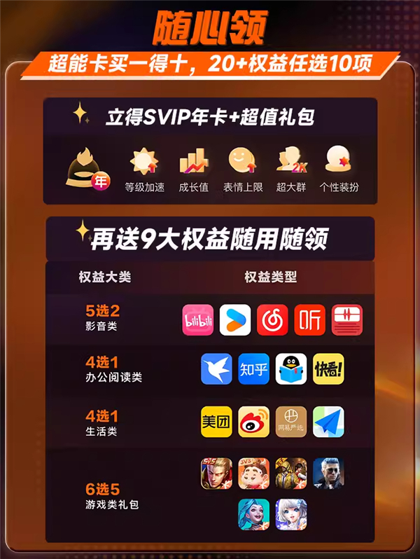 腾讯QQ超级会员超能卡618 返场狂促价198元,买1得10,20+权益任选10项。