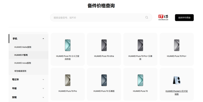 IT之家 6 月 23 日消息,华为 Pura 70 北斗卫星消息版手机上线华为官网维修备件价格查询页面。