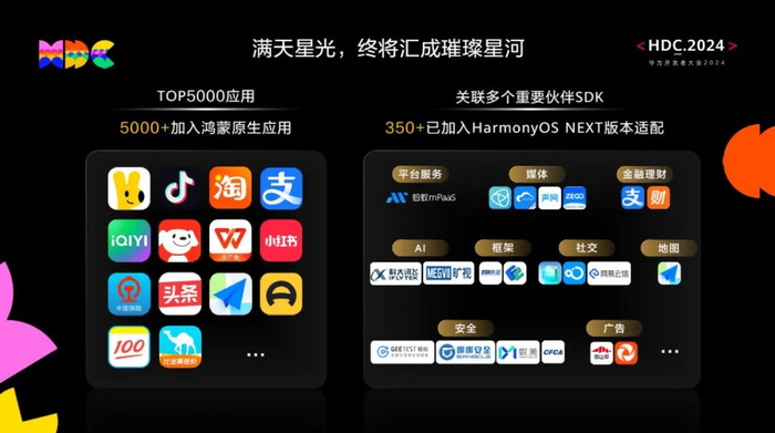 其中蚂蚁 mPaaS 已推进 200 + 企业启动对接测试,驱动上千个 App 适配 HarmonyOS NEXT 版本,此外已有美团、抖音、高德、淘宝、支付宝、微博、哔哩哔哩、去哪儿等超 5000 款应用相继加入鸿蒙生态。