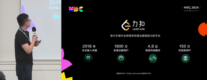 最后,力扣 LeetCode 移动端技术组长叶海健上台演讲。力扣是一个程序员 IT 技术职业化提升平台,目前已有 1800 万全球注册用户,不少程序员在上面练习算法题。