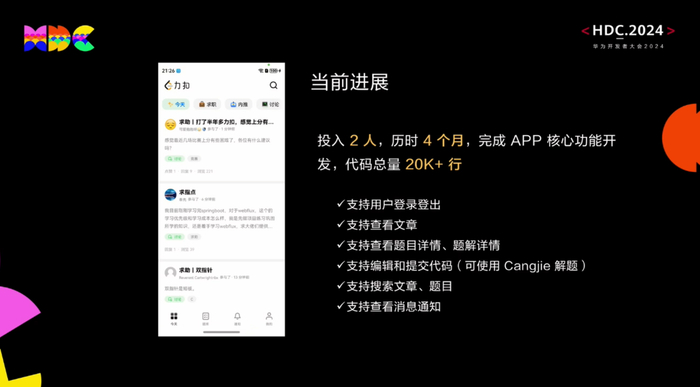 力扣鸿蒙原生应用投入 2 人研发,历时 4 个月完成了 App 核心功能开发,代码总量 20K+ 行。