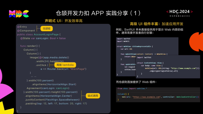 力扣开发者也提到了声明式 UI 开发,并且仓颉提供了很简单的 Web 组件(下图右下角所示),可以直接调用。