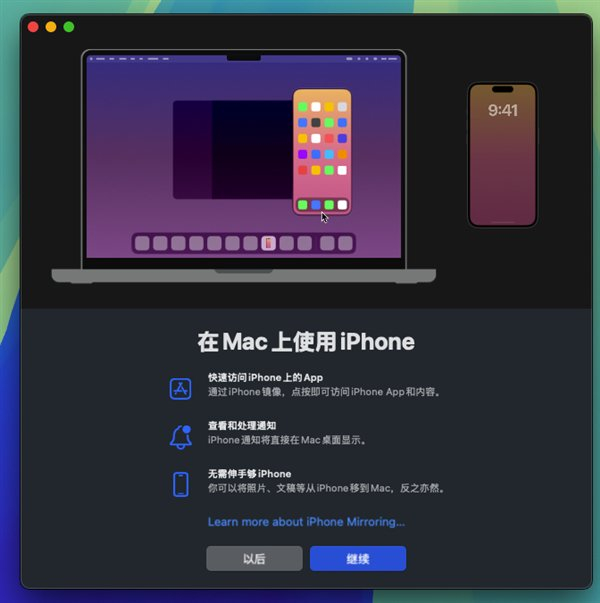 据了解,iPhone镜像可以让Mac用户将iPhone屏幕镜像到Mac上,可以在Mac直接回复iPhone上的消息、接收通知,甚至进行无缝拖放操作,实现跨设备的同步体验。
