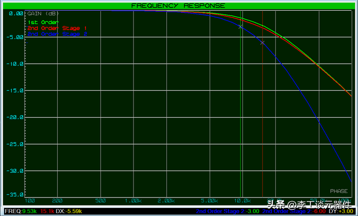 在这种情况下,我们可以看到二阶滤波器的阶段 1 与一阶滤波器的阶段 1 完全匹配,并且截止频率如预期为 15.9kHz。