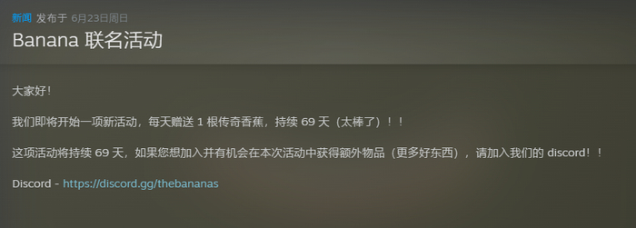 另外就在昨日,官方宣布开启为期69天的传奇香蕉赠送活动,每周都会随机发放一根传奇品质的香蕉。