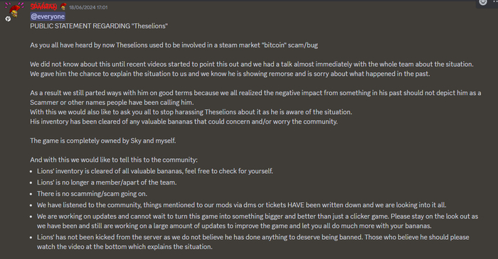 在Theselions的事迹被曝光后,《Banana》的开发团队也第一时间在官方频道上公开了声明,其中有几个要点: