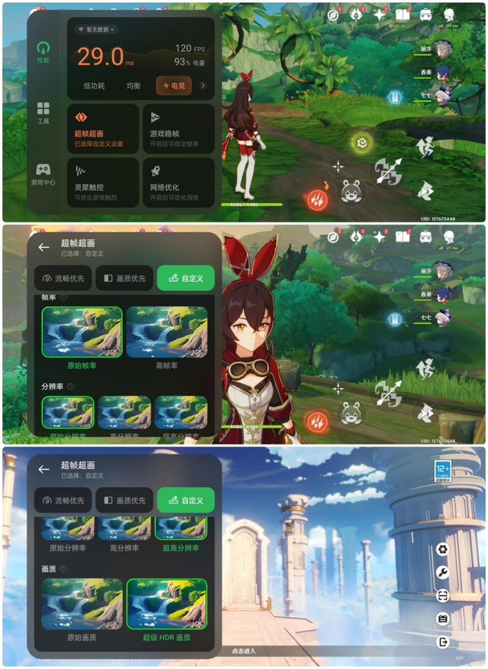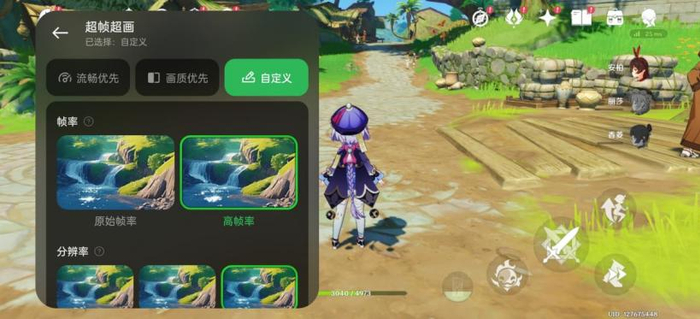 我们以原神为例,如上图所示,呼出游戏工具栏,选择“超帧超画”选项,点击高帧率选项,即可开启游戏的原生级 120 帧体验。