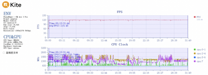 我们直接来看下面的帧率实测图,30 分钟的原生级 120 帧测试,一加 Ace 3 Pro 全程稳帧 120fps,实测平均 fps 为 119.44,接近满帧表现,这可是实打实,没有丝毫水分的原生级 120 帧。