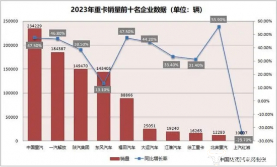 数据显示,2023年上汽红岩重卡年销量为10007辆,同比下滑23.7%,市占率进一步下滑后降到1.10%,是行业前十中唯一一家销量下滑的重卡企业。