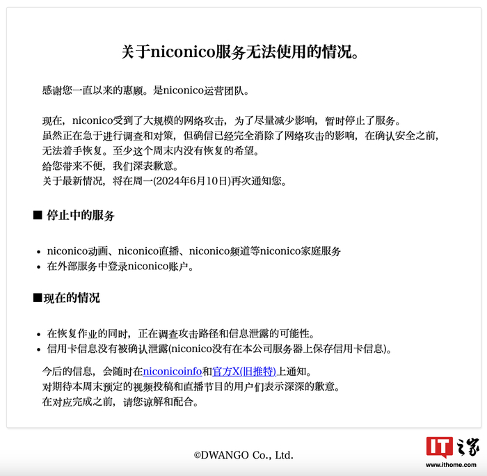 随后相关网络安全事件事态扩大,母公司角川集团发出声明证实,不光是 niconico,角川官网及旗下电商平台 Ebten 都受到影响,相关网站一度无法访问,而 niconico 据称物理拔掉了服务器的电源线、通信电缆,以防止感染扩散,这也导致了该网站数据中心内所有的服务器都无法使用。