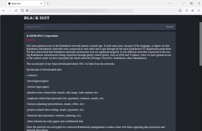 黑客组织 BlackSuit 宣称为 niconco / 角川集团网络攻击事件负责,未付清赎金将公布 1.5T 机密文件
