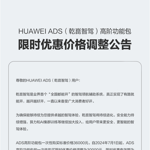 IT之家 6 月 30 日消息,华为智能汽车解决方案今日发布乾崑智驾 ADS 高阶功能包限时优惠价格调整公告:一次性购买限时优惠价格调整至 3 万元。