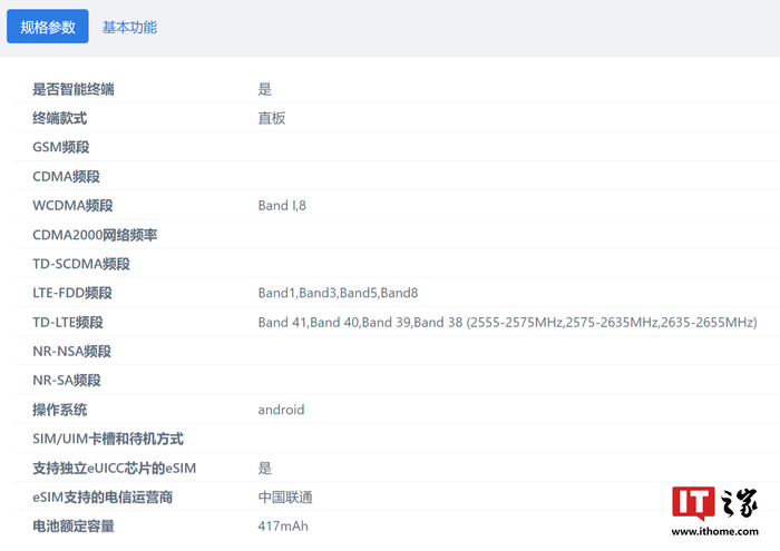 Galaxy Watch 7 国行型号 SM-L3150,电池额定容量 417mAh,支持 WCDMA 与 LTE 网络,并支持中国联通 eSIM 独立通信。