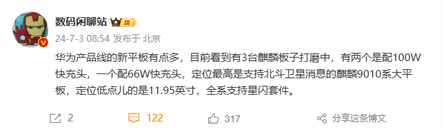 结合 @数码闲聊站 的爆料,至少有 3 款华为平板电脑将采用了海思麒麟 SoC,其中定位最高一款机型搭载麒麟 9010 系芯片,支持北斗卫星消息,另外一款 11.95 英寸的定位稍低,不过全系支持星闪套件。