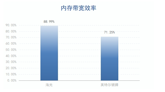 第二项测试是内存带宽效率测试,内存带宽效率是内存实测带宽和理论带宽的比值。这项测试的背景在于,内存数量较少的低成本方案中,高内存带宽效率可以提供优异性能,这对很多中小企业和个人用户来说很重要。