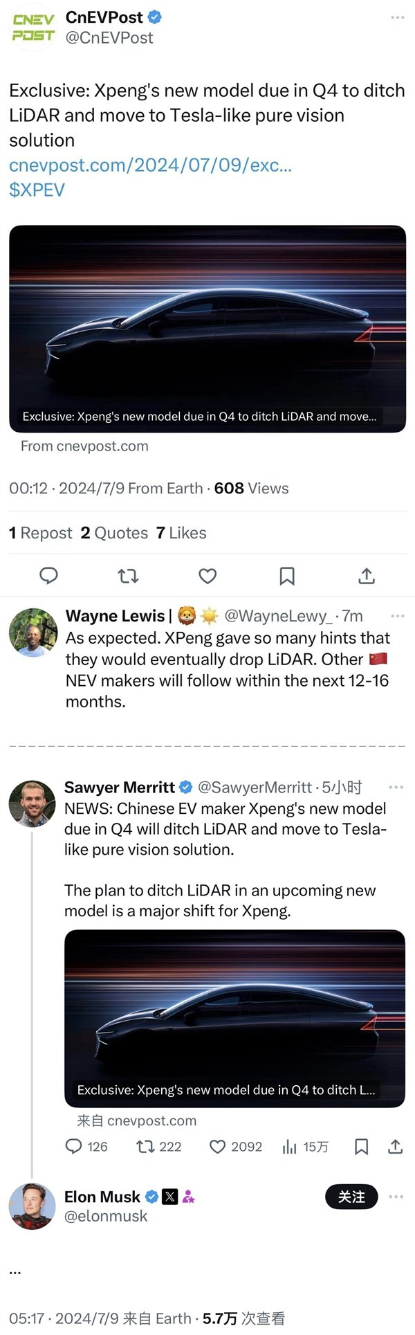 报道指出,小鹏将于今年四季度推出的全新车型会移除激光雷达,并采用和特斯拉类似的视觉方案,而特斯拉CEO马斯克同样关注到了这篇报道,其回复了“三个点”,不清楚到底作何感想。
