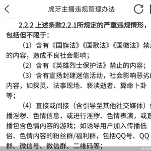 这是虎牙2023年7月更新的主播管理办法,同年虎牙因提供网络表演含有危害社会公德内容,被广州市文化广电旅游局罚款3万元、没收违法所得590.5元。