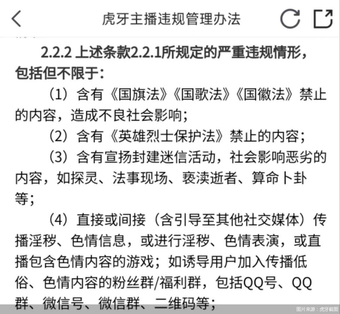 《虎牙主播违规管理方法》明确,主播直接或间接(含引导至其他社交媒体)传播淫秽、色情信息,或进行淫秽、色情表演,或直播包括色情内容的游戏;如诱导用户加入传播低俗、色情内容的粉丝群/福利群,包括QQ号、QQ群、微信号、微信群、二维码等,属于严重违规(A类违规)。