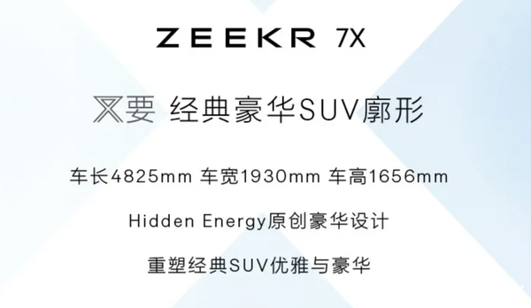 近日,极氪官方宣布,极氪首款豪华大五座SUV正式命名为“7X”,该车定位于中型纯电SUV,采用与极氪007轿车同平台打造,计划会在8-9月份正式上市。
