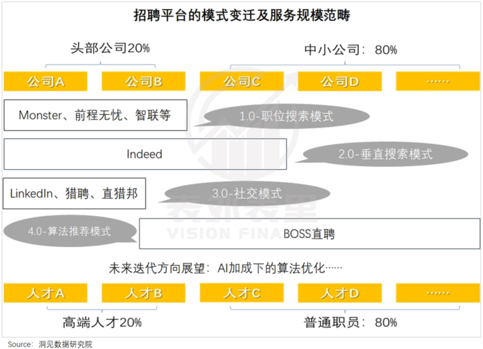 但改善匹配效率,也一直是行业换际迭代的动力,从海外到国内,从以Monster、前程无忧为代表的Job Board(职位广告版)模式,到以Indeed为代表的搜索模式,再到以领英为代表的社交模式,以及ZipRecruiter、BOSS直聘等新一代平台,每一代后来居上的平台,都具有一定的颠覆性意义。