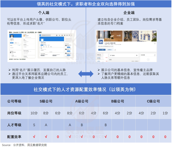 与Indeed几乎同期诞生的领英,主打社交模式,让招聘双方可以像经营朋友圈一样经营自己的领英。这不仅让信息更加透明,还可以通过人脉关系加深对彼此的了解,撮合效率有所提高。