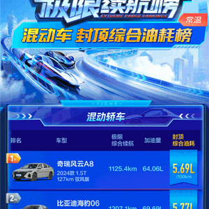 易车公布的极限续航榜单显示,混动轿车阵营中,油耗最低的是奇瑞风云A8 2024款1.5T 127km驭风版,极限续航1125.4km,加油量64.06L,封顶综合油耗为5.69L/100km。