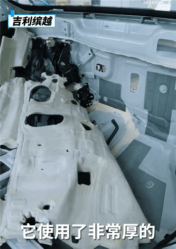 作为对比,吉利缤越地垫下方使用的都是灰色的纤维棉,而且在防火墙处,使用了非常厚的泡沫发泡材质,这样的组合相比于回收棉来说,有害物质释放量更少。