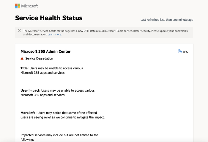 微软官网一条不断更新的服务健康状态显示,目前用户可能无法访问各种 Microsoft 365 应用和服务,微软称正在解决。