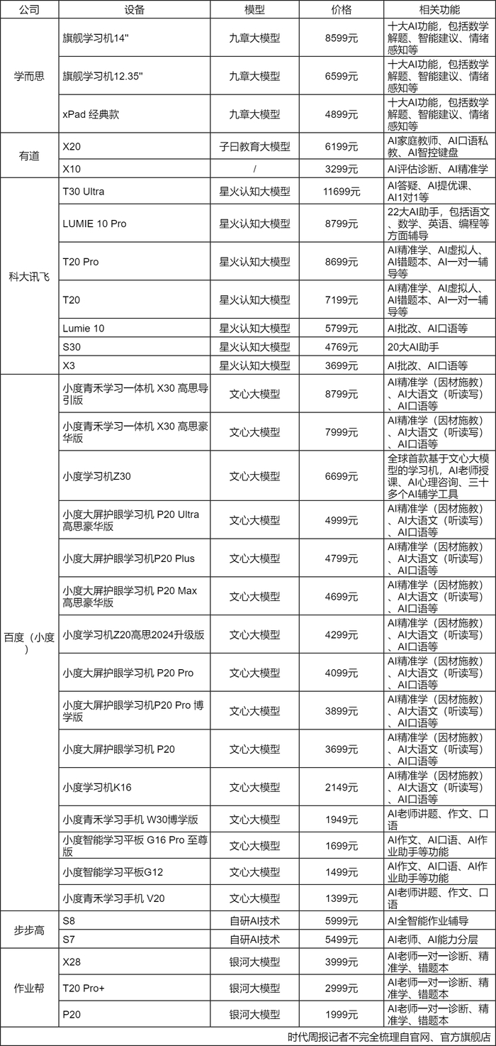 但据时代周报不完全统计,搭载AI功能的学习机大多价格在5000元以上,几家厂商的旗舰级学习机价格接近9000元,而内置星火大模型科大讯飞AI学习机新品 T30 Ultra,其12GB+1TB 版本价格上万。
