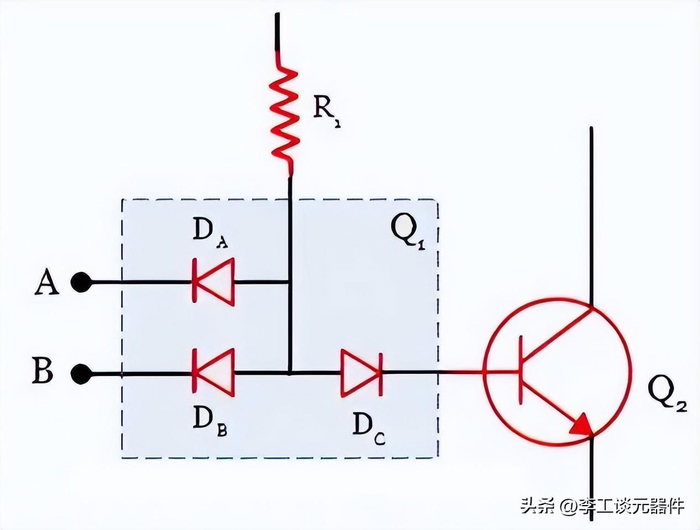 在图中,二极管DA和DB代表晶体管Q 1的2输入发射极结。二极管 DC代表晶体管 Q2的集电极-基极结。